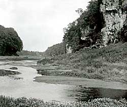 The photograph on the right by J W Jackson shows Creswell Crags from the east end in about 1874 before Millward Brook was dammed.