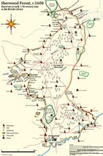 Several maps of Sherwood Forest’s extent and boundary also survive, the earliest ones dating from the late 16th or early 17th centuries. It has been suggested that the need to produce these maps was created by “a decline in the practice of perambulating the forest’s bounds in the late 16th and early 17th centuries and the consequent shortage of communal memory to identify the boundary’s course conclusively.” The map on the right shows the extent of Sherwood Forest in the early 17th century and includes many boundary points listed in the perambulations.
