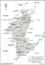 The forest area defined by these boundaries covered approximately 90,000 acres (about 17% of the county) of land composed of poor, acid soils overlying the Sherwood sandstones which run north-south along the western side of the county. The boundary was defined to a large extent by rivers: the Trent on the south, Doverbeck to the south-east, the Leen to the south-west and the Meden on the north. The poverty of the soils created a landscape with substantial tracts of open sandy heath, interspersed with woodland, a handful of deer parks in addition to almost fifty settlements, the town of Mansfield and the borough of Nottingham. However, although Nottingham lay within the boundaries of Sherwood Forest it appears to have been exempt from forest law.