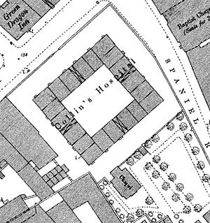Map showing location of Abel Collin Almshouses on Friar lane/Spaniel Row. Manuscript.