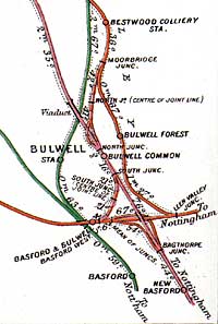 Railway Clearing House railway junction diagram of the Basford and Bulwell area north of Nottingham in 1913.