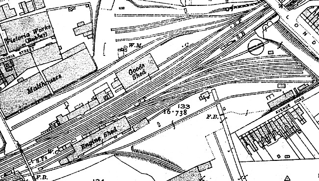 The Great Central engine and goods sheds and sidings at Thrumpton Lane, Retford as depicted on the 25" to a mile Ordnance Survey map (1920).